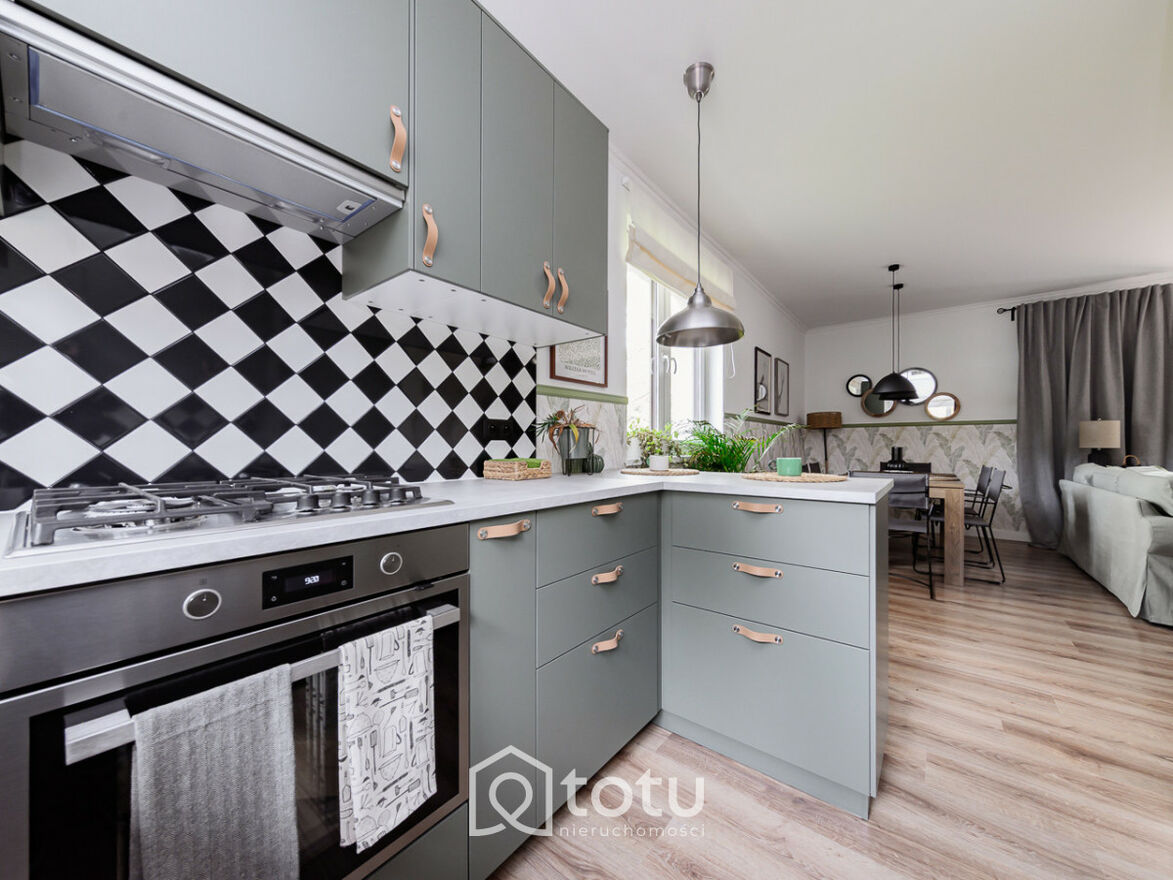 - Część dzienna: salon (ok. 28 m²) z wyjściem na taras i ogród, jadalnia, kuchnia z pełną zabudową oraz sprzętem AGD, przestronny hol, pomieszczenie gospodarcze,